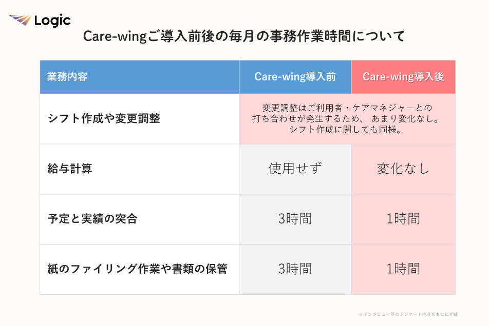 Care-wing導入前後の比較表