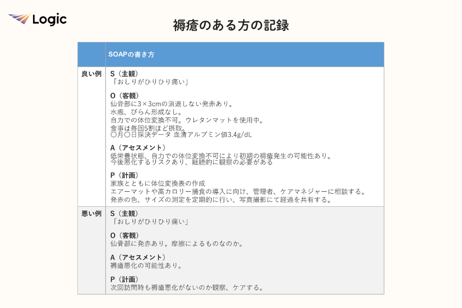 • 褥瘡は圧迫や摩擦、栄養状態など複数の要因が関係するため、具体的なデータを記録に残すことが大切