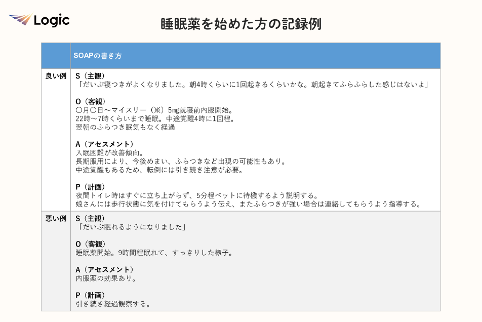 • 「よく眠れるようになった」だけではなく、途中目が覚めてしまわないかなど患者の睡眠の質をよく聞き、具体的に記載できている