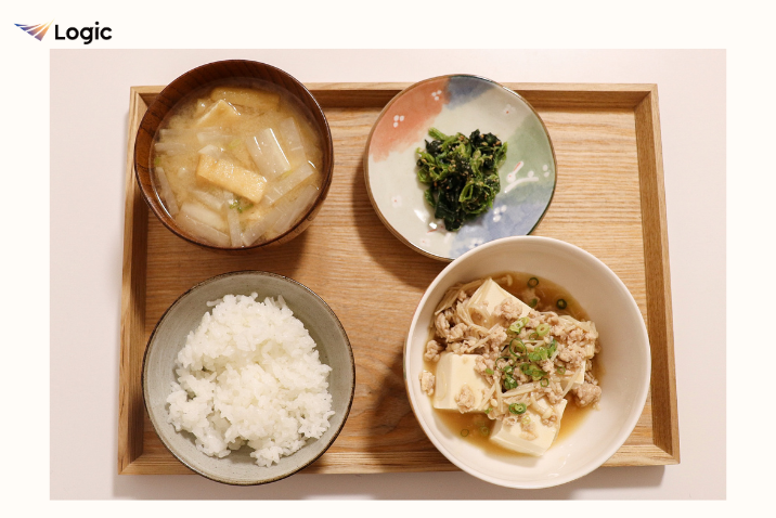 主菜のあんかけは鶏ひき肉と豆腐でタンパク質を確保し、きざみ野菜を追加すれば栄養価もアップします。