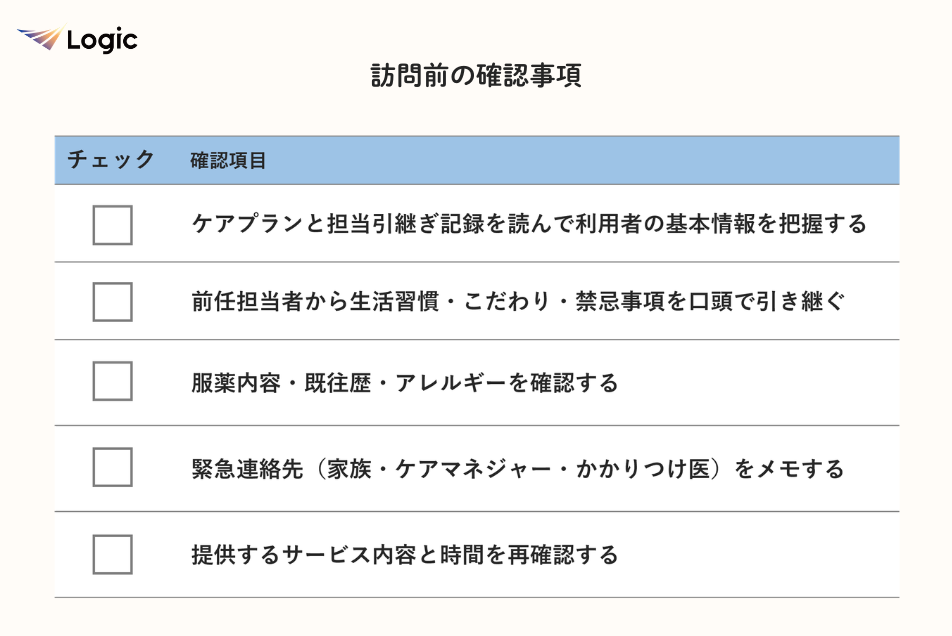 何となく訪問するのではなく、訪問前・訪問時・訪問後の3段階でしっかりと準備と確認を行うことが、今後のトラブル防止と利用者の安心につながります。