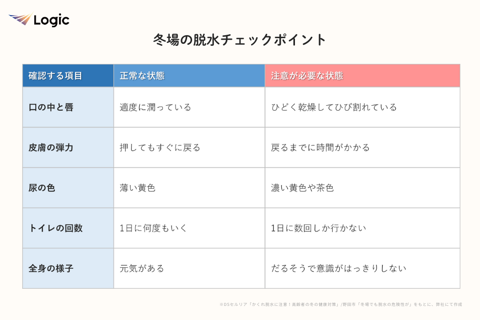 冬は、トイレでの着脱時に寒さを感じるため、トイレに行く回数を減らしたいために水分補給を控える高齢者は少なくありません。その結果、以下のような問題が起こりやすくなります。